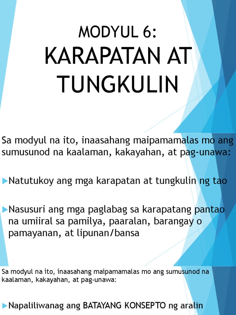 KARAPATAN AT TUNGKULIN Sa paksang ito ating tatalakayin kung paano nga ba maiuugnay ang dignidad ng isang tao sa kanyang mga karapatan at tungkulin. Sumali o magsimula ng isang lokal na pangkat. Nasusuri ang mga paglabag sa karapatang pantao na umiiral sa pamilya paaralan barangaypamayanan o lipunanbansa.