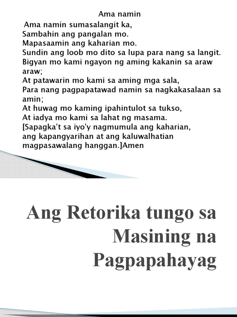 1 question Bakit mahalaga ang maikling kuwento sa larangan ng panitikan. RETORIKA Sa paksang ito ating tatalakayin kung ano nga ba ang kahalagahan ng retorika at ang mga halimbawa nito. Pagsasanay 2ang wastong tono ng bawat pahayag batay sa layunin nito.